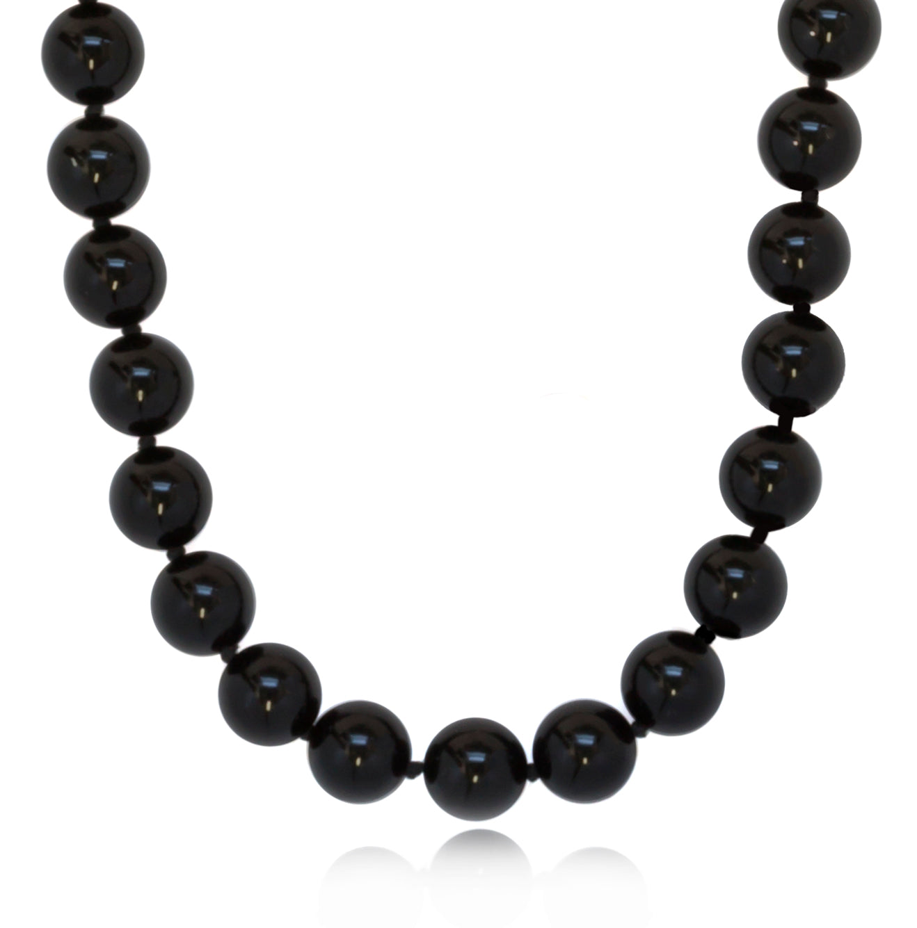 A timeless classic, this gorgeous necklace features the shiny and pure blackness of pure onyx beads. Give yourself this versatile piece to complete any look! 10mm Polished Black Onyx Necklace Individually Knotted on Matching Black Silk with a French Wire Finish Rhodium Plated 925 Sterling Silver Fishhook Clasp