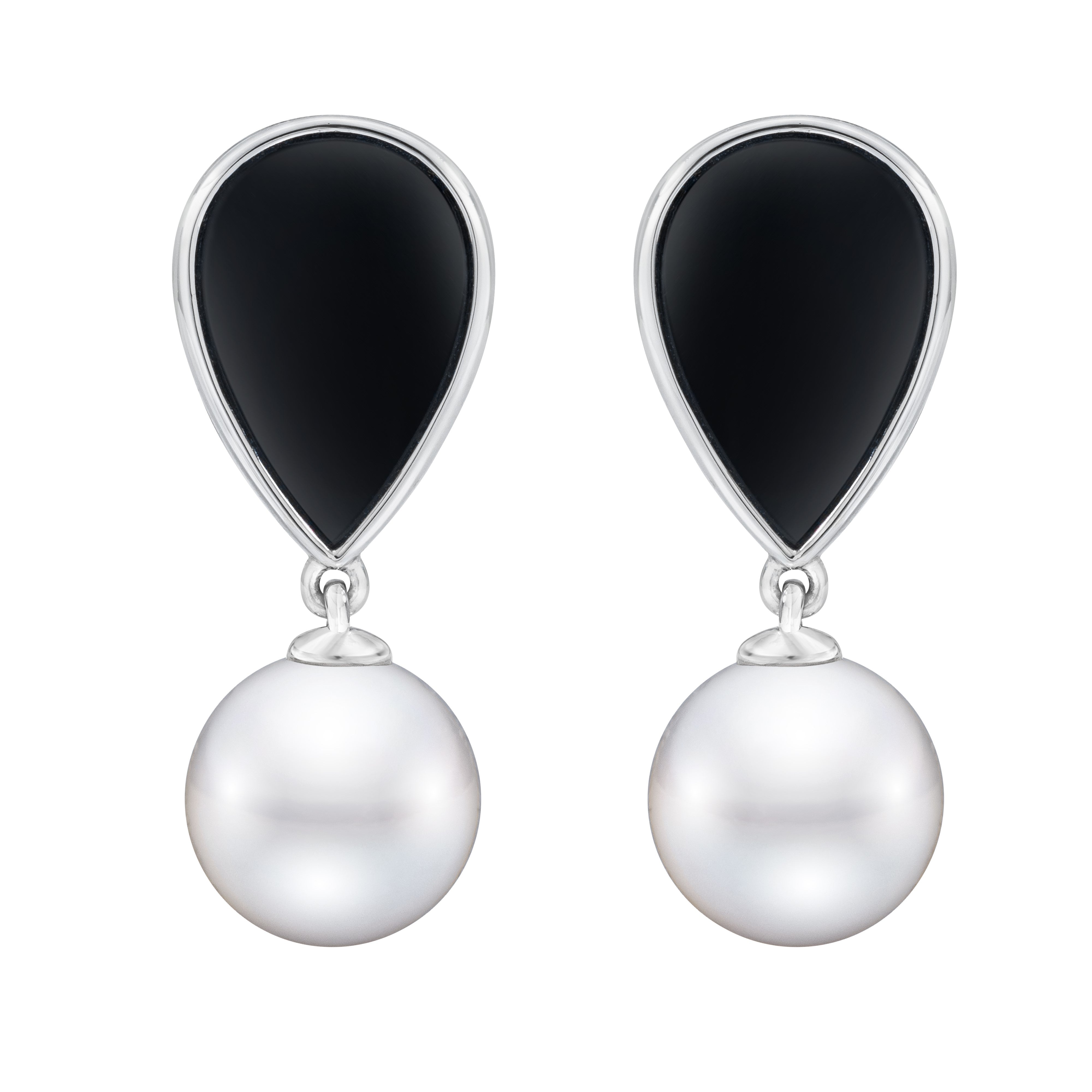 14K WHITE GOLD EARRINGS FEATURING BLACK ONYX AND FRESHWATER PEARLS BEZEL SET POLISHED BLACK ONYX GEMSTONES 8X12MM ROUND CULTURED FRESHWATER PEARLS 8-9MM