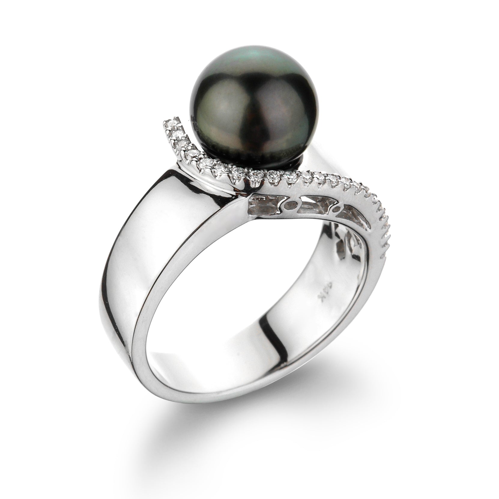 Beautiful High Luster Black Tahitian Cultured Pearl Ring Tahitian Pearl Measures 9 - 10 millimeters Round Brilliant Diamonds, 0.10 CTTW G - H VS 14K White Gold Also Available in 14K Yellow Gold - Not Pictured
