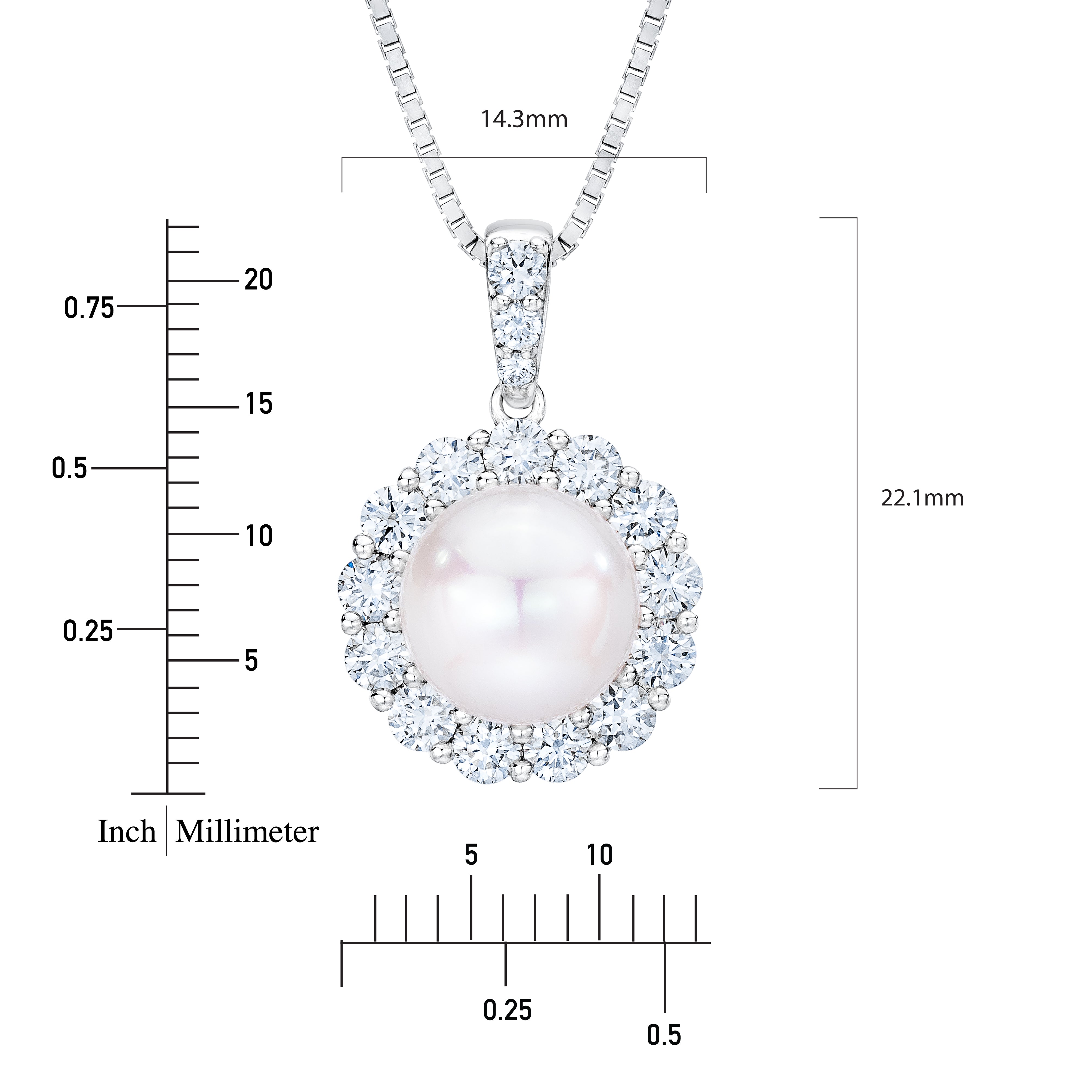 14K WHITE GOLD FRESHWATER PEARL PENDANT WITH ROUND BRILLIANT DIAMOND HALO WHITE CULTURED FRESHWATER PEARL 9-10MM ROUND BRILLIANT DIAMONDS 1.20 CTW ADJUSTABLE 20 INCH BOX CHAIN