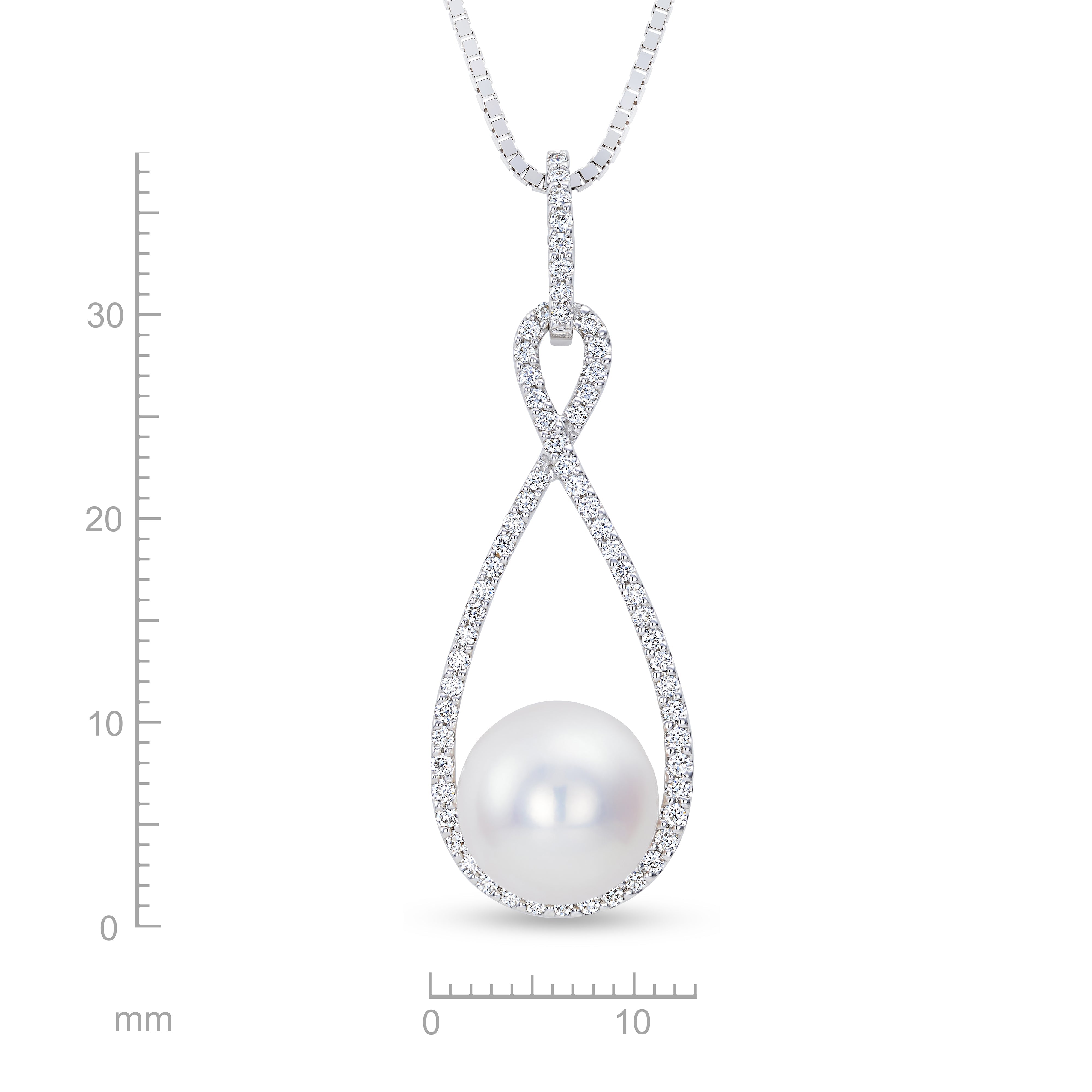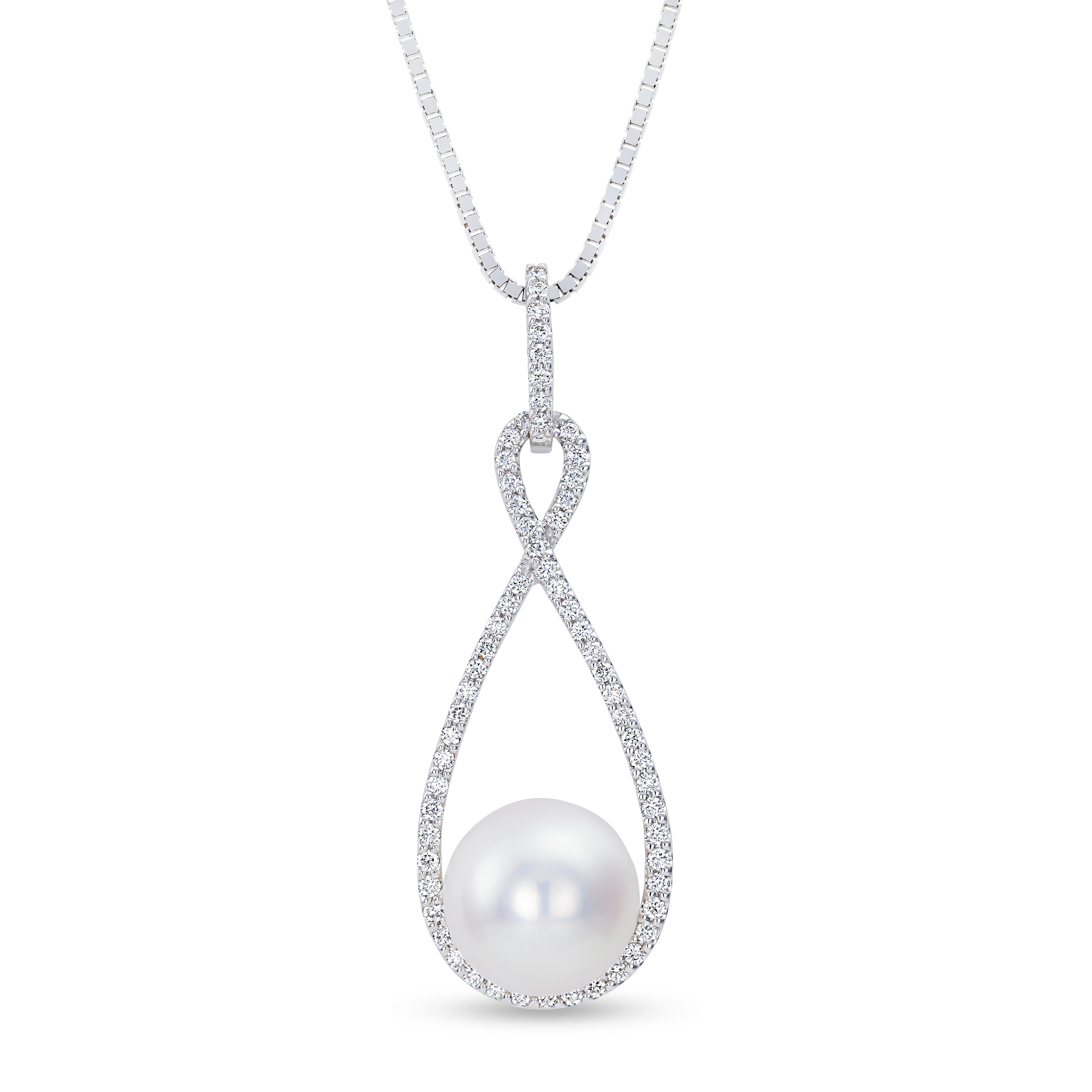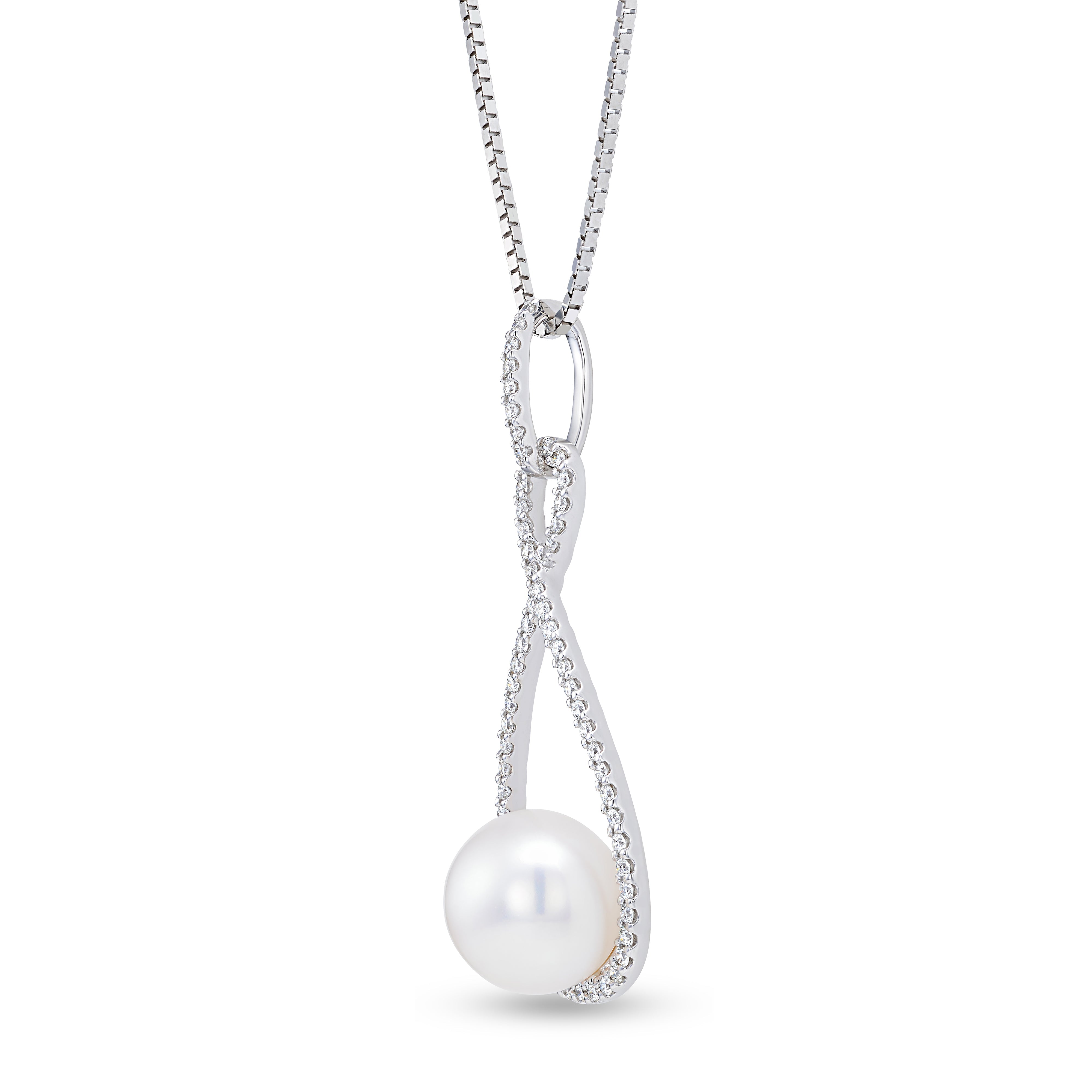 14K WHITE GOLD PENDANT WHITE CULTURED FRESHWATER PEARL 9.5-10MM ROUND BRILLIANT DIAMONDS 0.35 CTW ADJUSTABLE 20 INCH BOX CHAIN