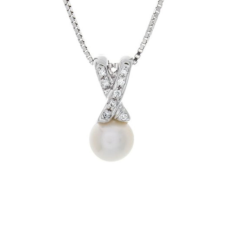 This fine pendant features a beautiful high luster Japanese Akoya Pearl measuring 8 - 8.5mm and embellished with round brilliant diamonds, a total of 0.08ct, set in 14k white gold. A perfect addition to any outfit!