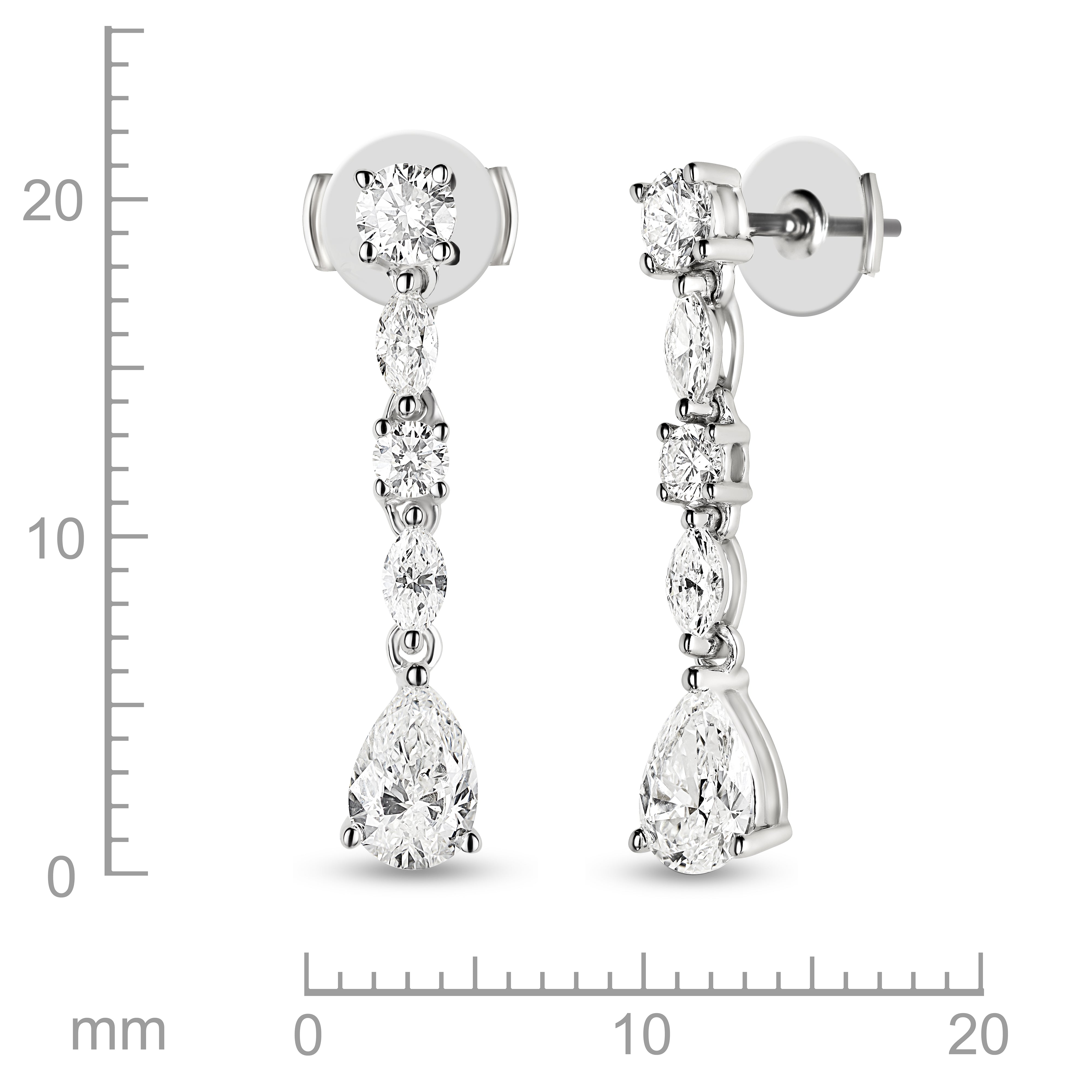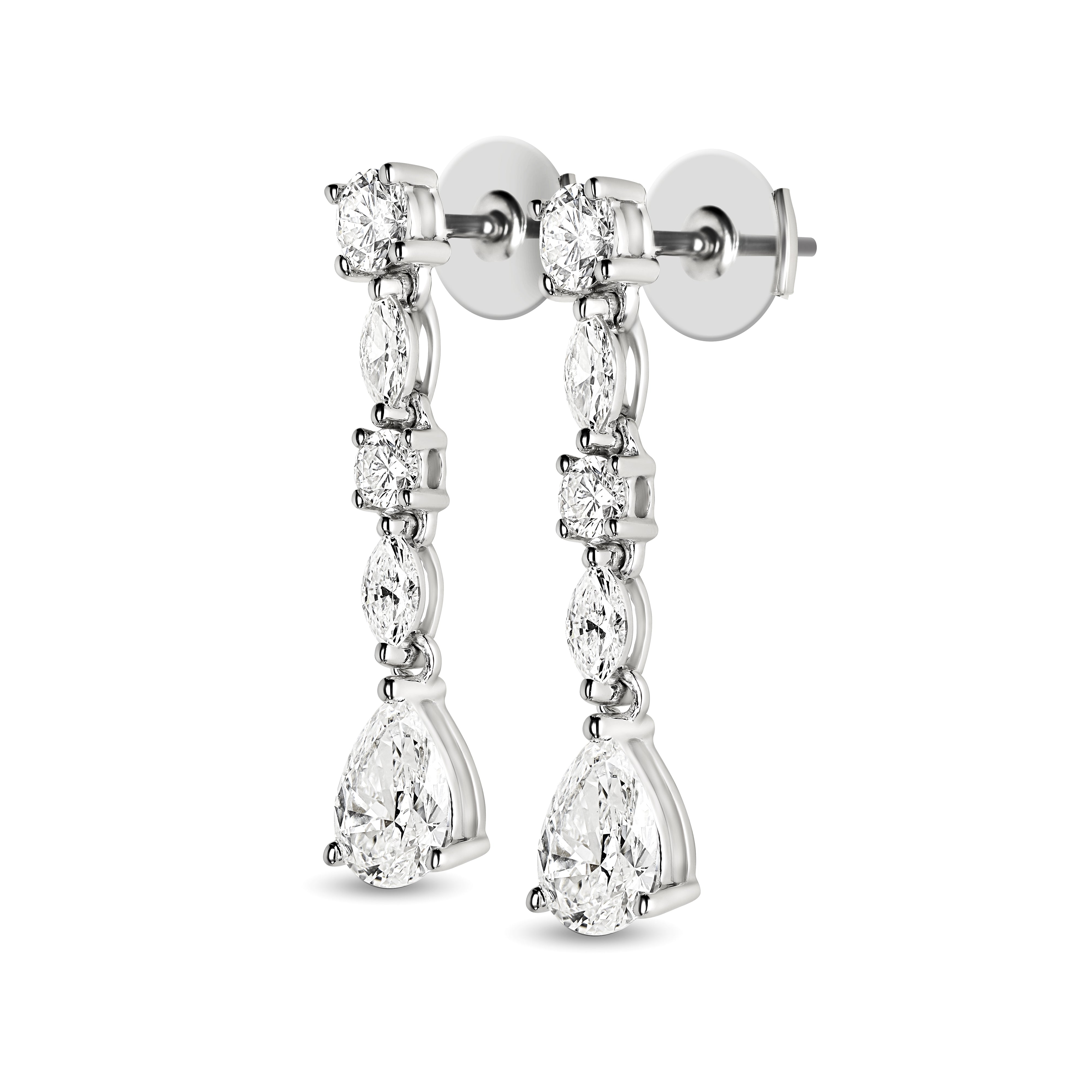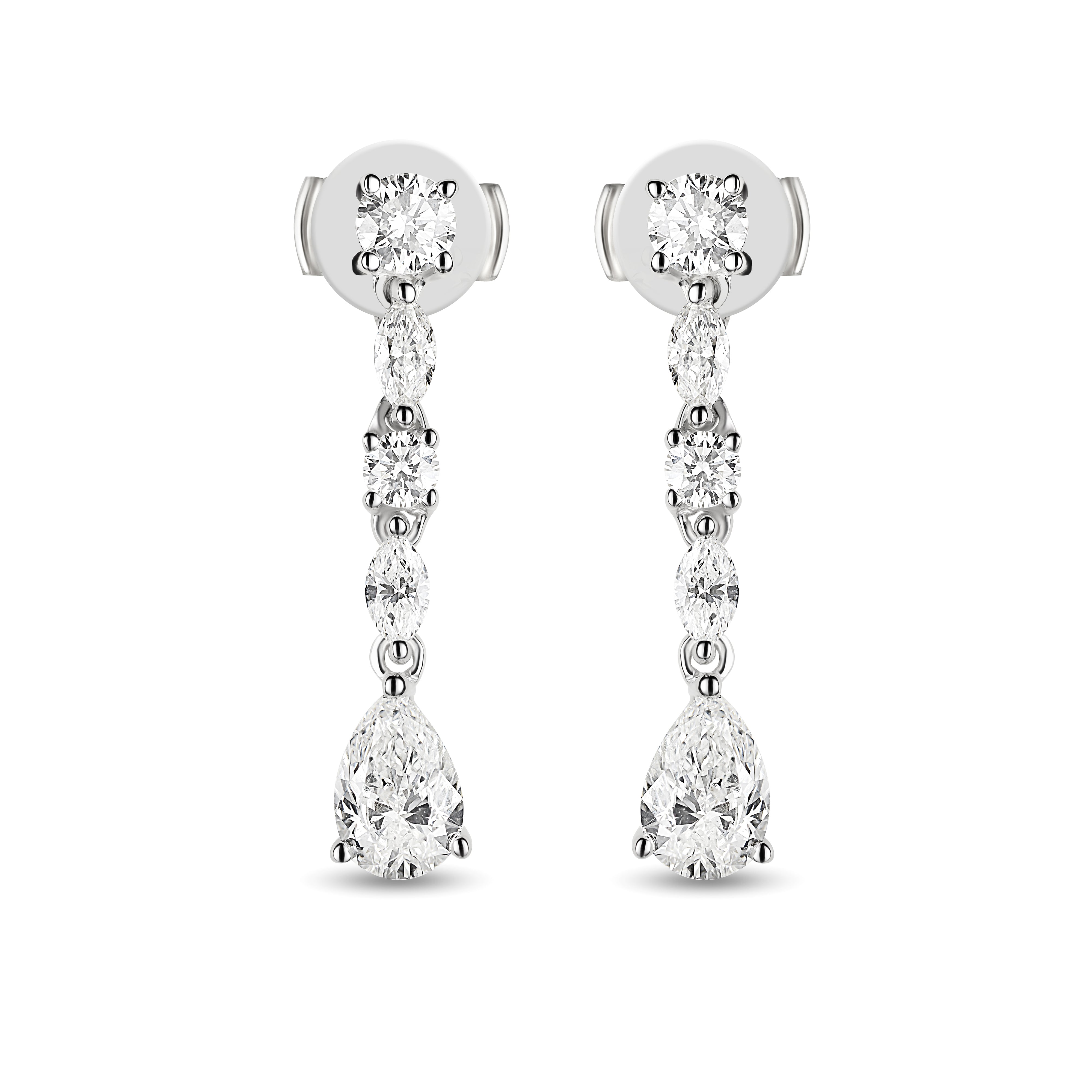 14K WHITE GOLD DANGLE EARRINGS ROUND BRILLIANT, MARQUISE, AND PEAR SHAPED DIAMONDS 1.38 CTW 0.40 CT PEAR SHAPED DIAMONDS SECURED WITH LA POUSETTE BACKS